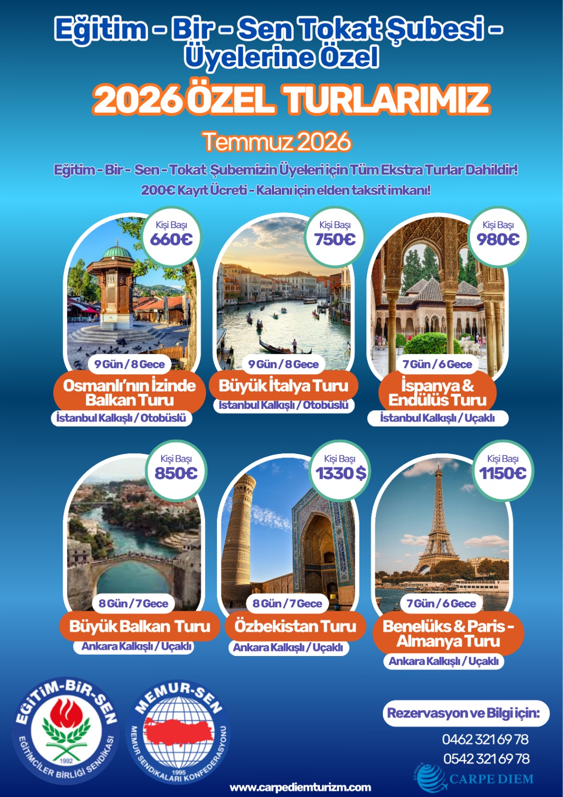 Osmanlı’nın izinde, Balkanların kalbinde 8 ülke, 5 başkent ve 24 şehri kapsayan bu özel yolculukta; Sofya’dan Belgrad’a, Srebrenitsa’dan Saraybosna’ya, Mostar’dan Ohrid’in büyüleyici göl manzaralarına uzanan tarih, kültür ve maneviyat dolu bir deneyimi Carpe Diem ayrıcalığıyla yaşıyoruz; ekstra turların ve akşam yemeklerinin dahil olduğu, konforlu otellerde konaklayacağımız, profesyonel rehberlik ve güçlü organizasyon desteğiyle her detayı düşünülmüş bu programda sadece gezmiyor, geçmişin izlerini hissediyor, Balkan ruhunu doyasıya soluyor ve her anı birlikte anlamlı bir hatıraya dönüştürüyoruz. Osmanlının İzinde Balkan Turu-Büyük İtalya Turu - İspanya Endülüs Turu- Büyük BalkanTuru-Özbekistan Turu-Benelüks Paris Almanya Turu ve diğer ayrıntılar için Müracaat Sadece 04623216978 / 05423216978